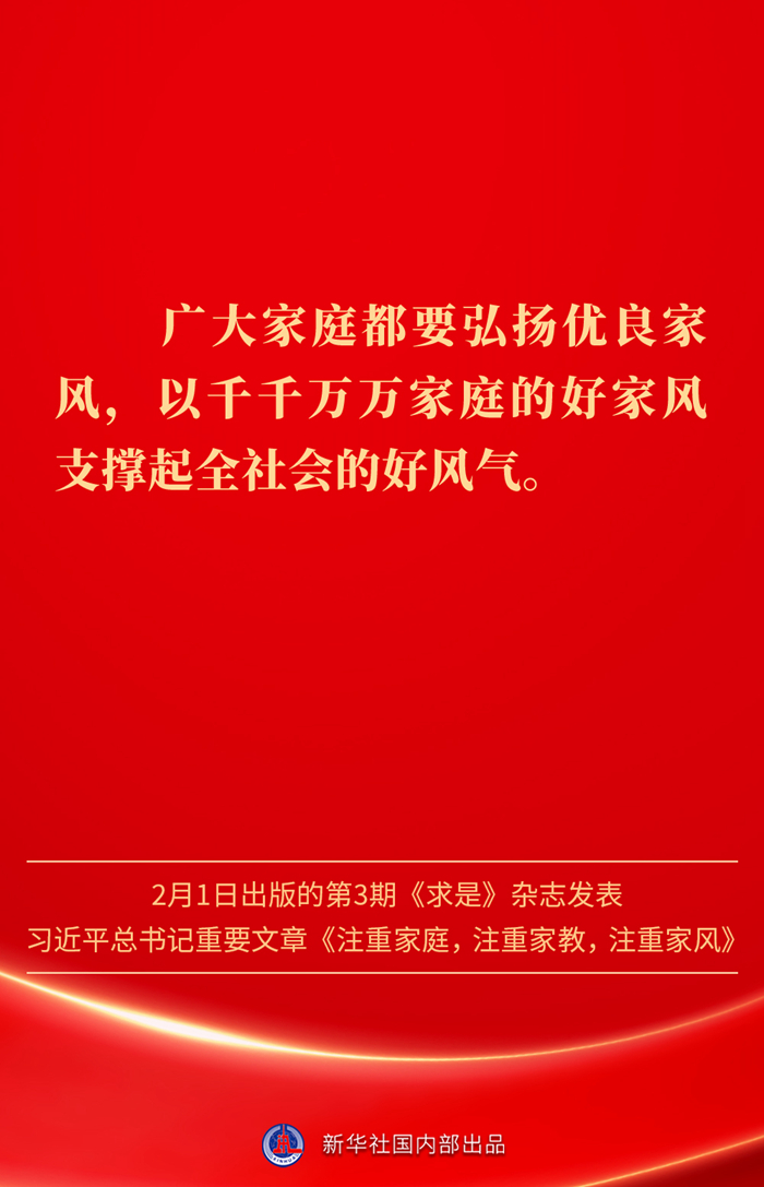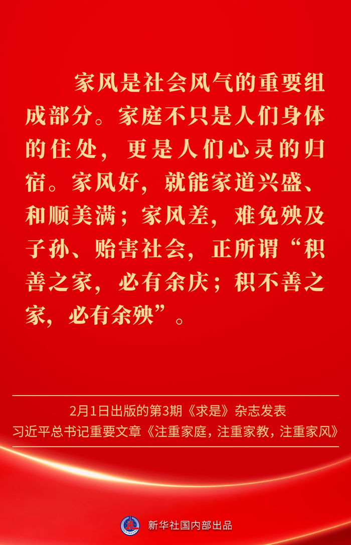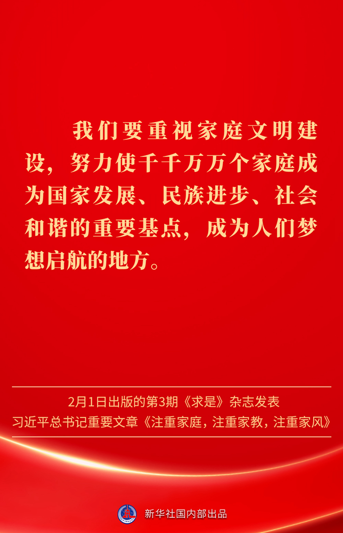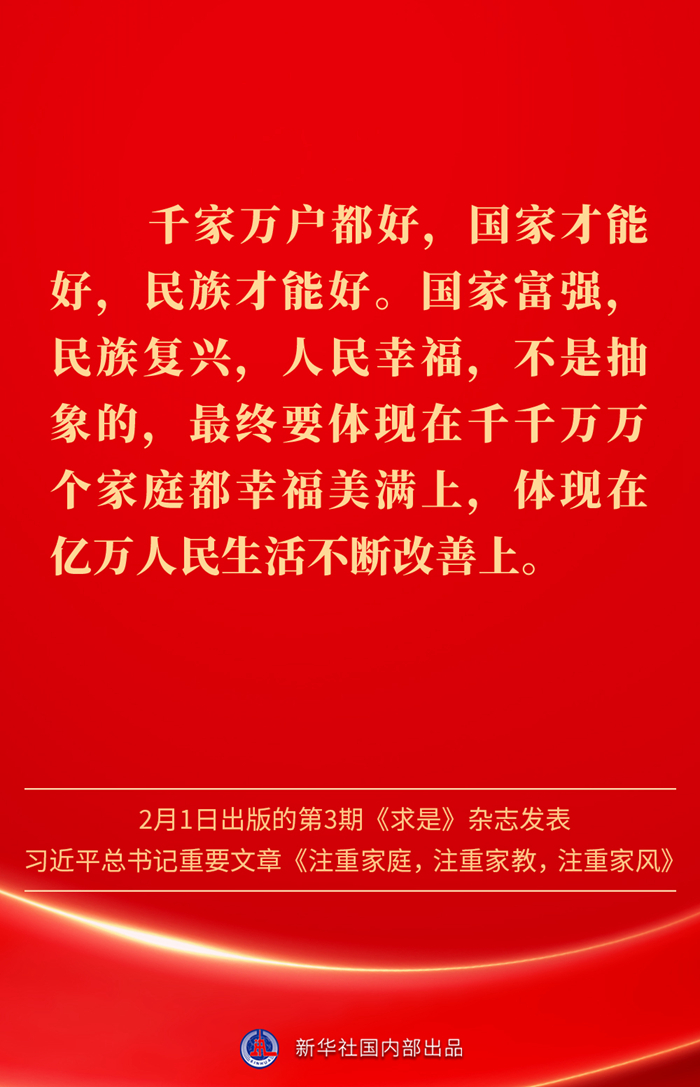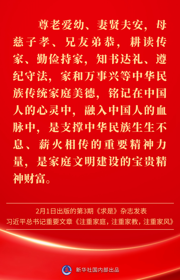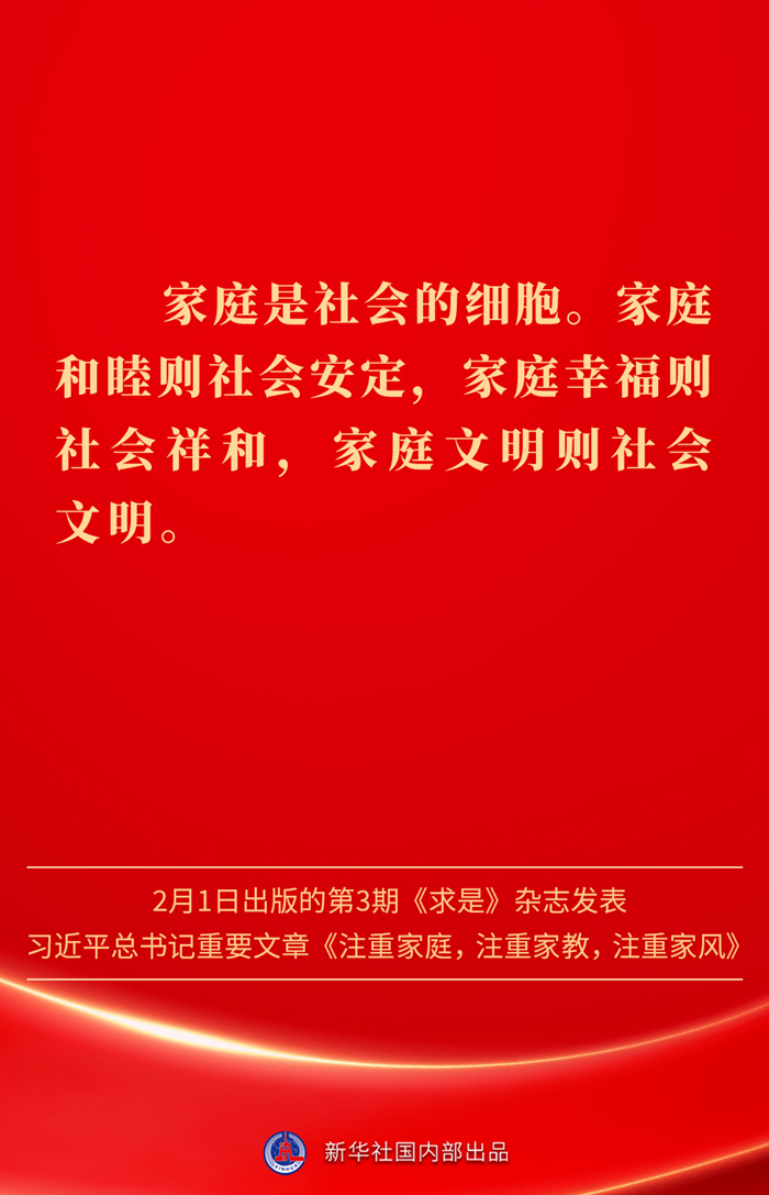 万家团圆共庆新春佳节之际,2月1日出版的第3期《求是》杂志发表习近平总书记重要文章《注重家庭,注重家教,注重家风》。为什么要注重家庭、家教、家风?如何做好家庭文明建设?习近平总书记这样阐述——