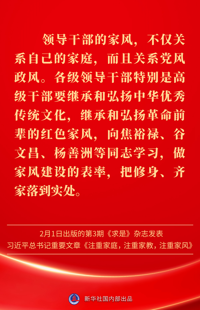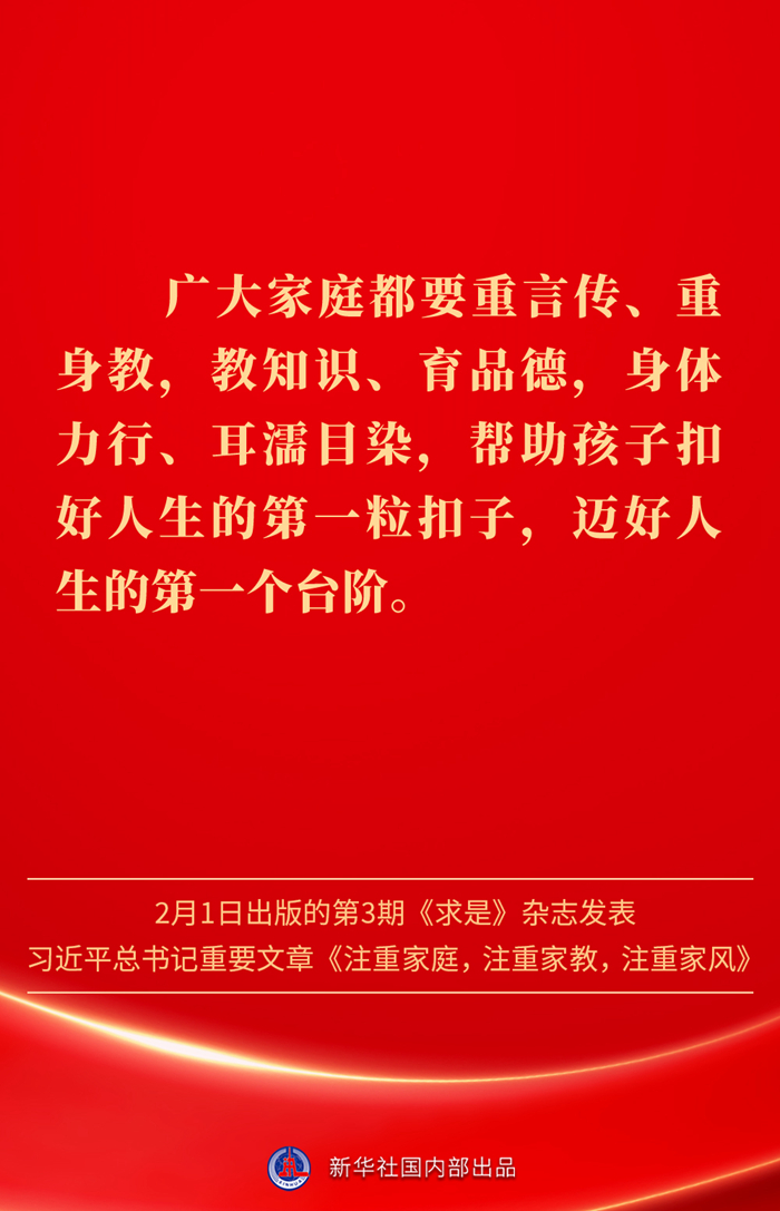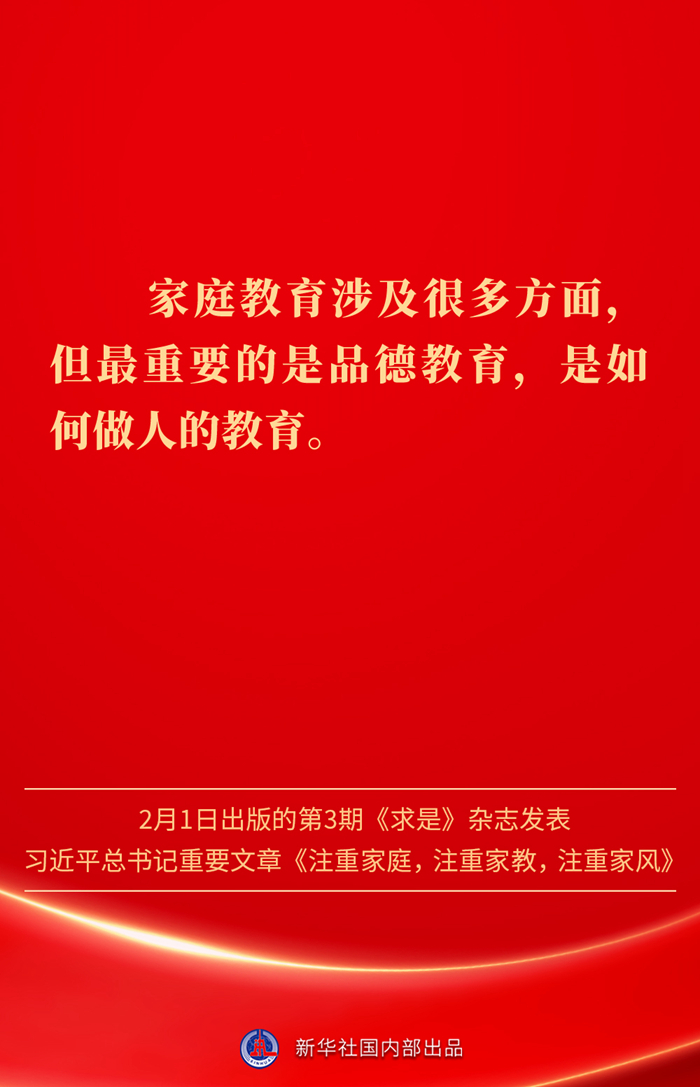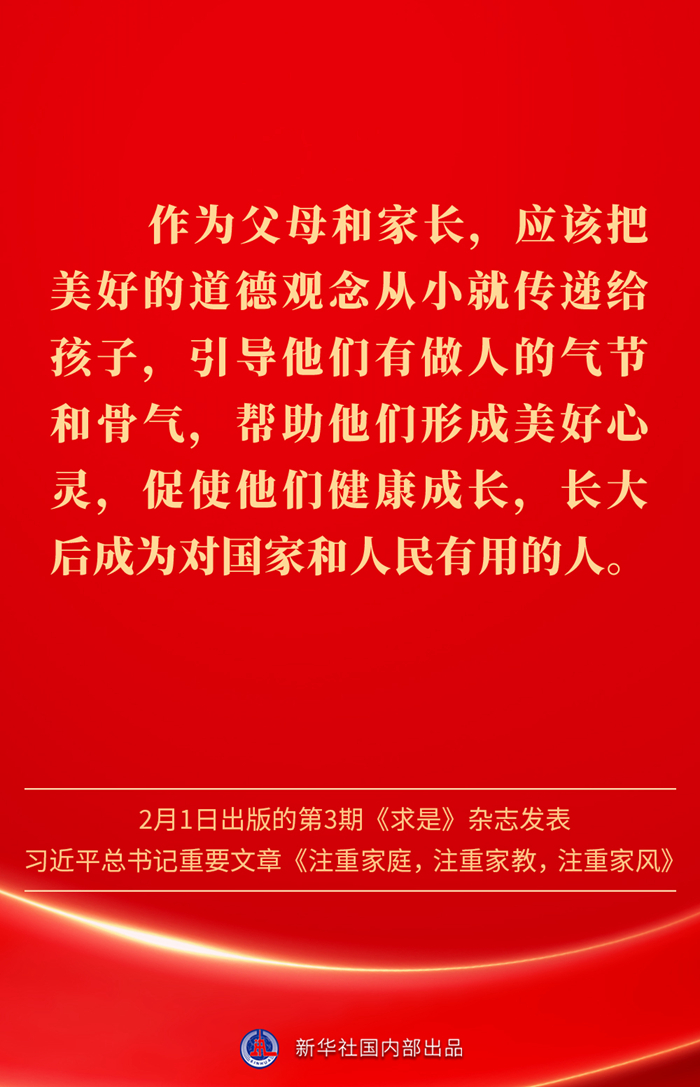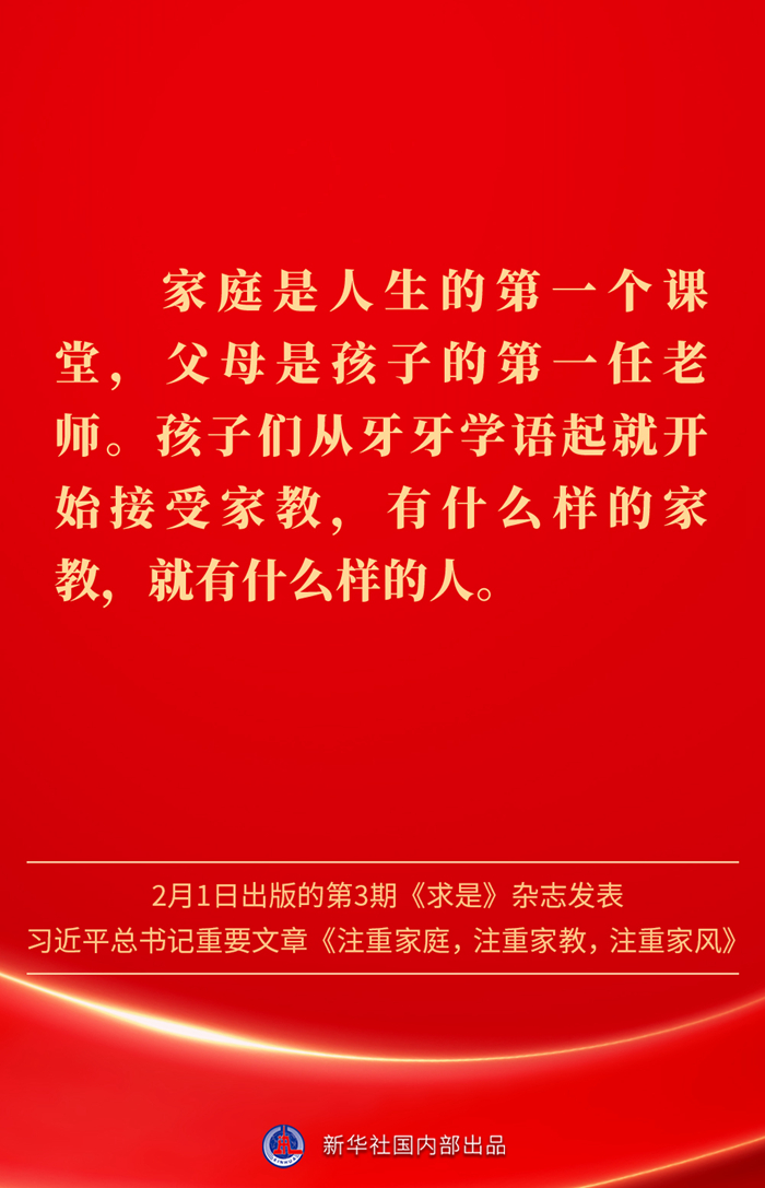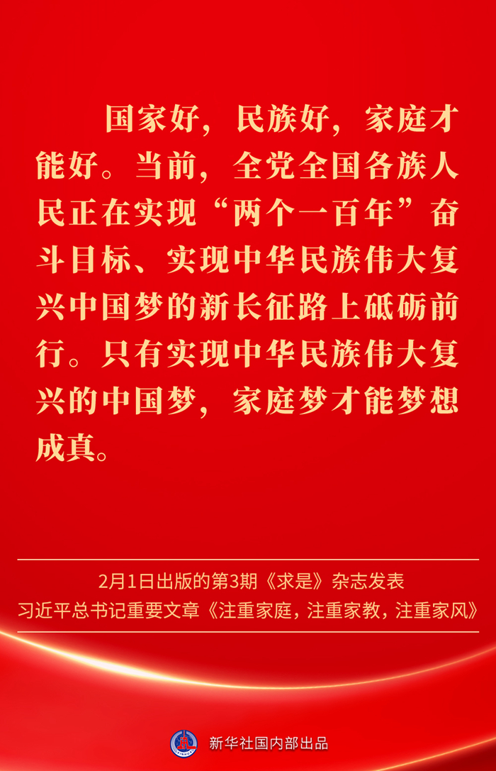 万家团圆共庆新春佳节之际,2月1日出版的第3期《求是》杂志发表习近平总书记重要文章《注重家庭,注重家教,注重家风》。为什么要注重家庭、家教、家风?如何做好家庭文明建设?习近平总书记这样阐述——